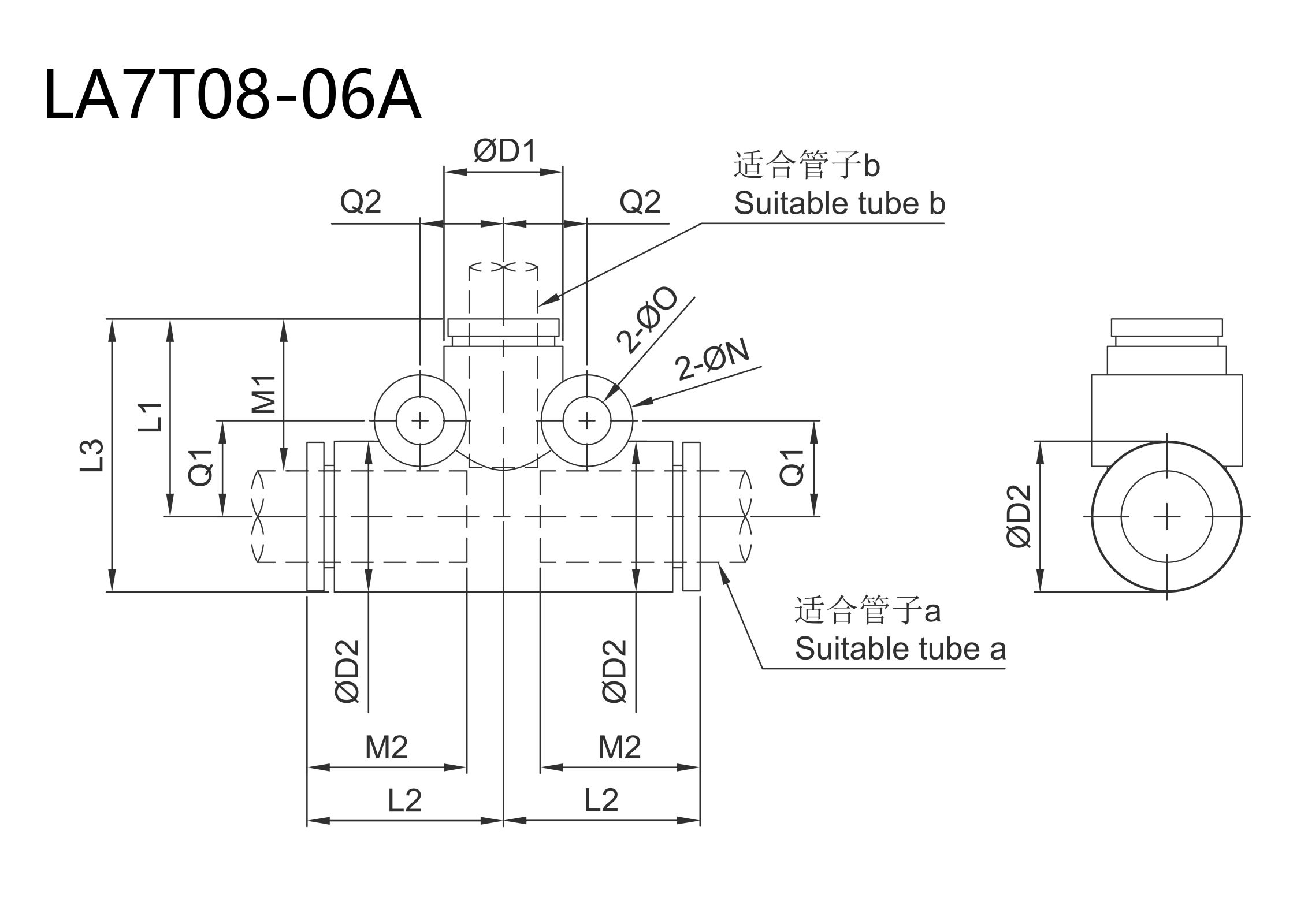 Tube O.D.mm                           Model ØD1*(mm) ØD2(mm) L1(mm) L2(mm) L3(mm) M1(mm) M2(mm) Q1(mm) Q2(mm) Q3(mm) ØN(mm) Effective cross-sectional area mm Minimum Hole  Diameter(mm)    Weight