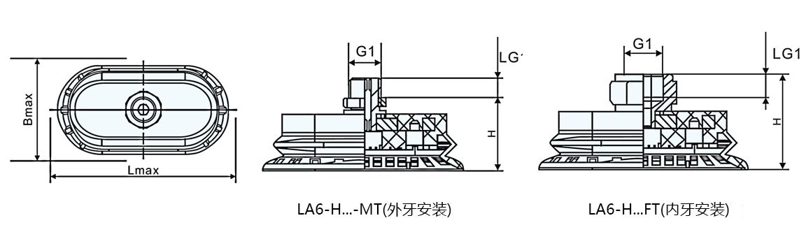 Model Nozzles(N)¹ Pull off(N)² Lateral force(N)² Recommended vacuum Inside(mm) Dmax(mm) Lmax(mm) G1(mm) H(mm) LG1(mm) Weight