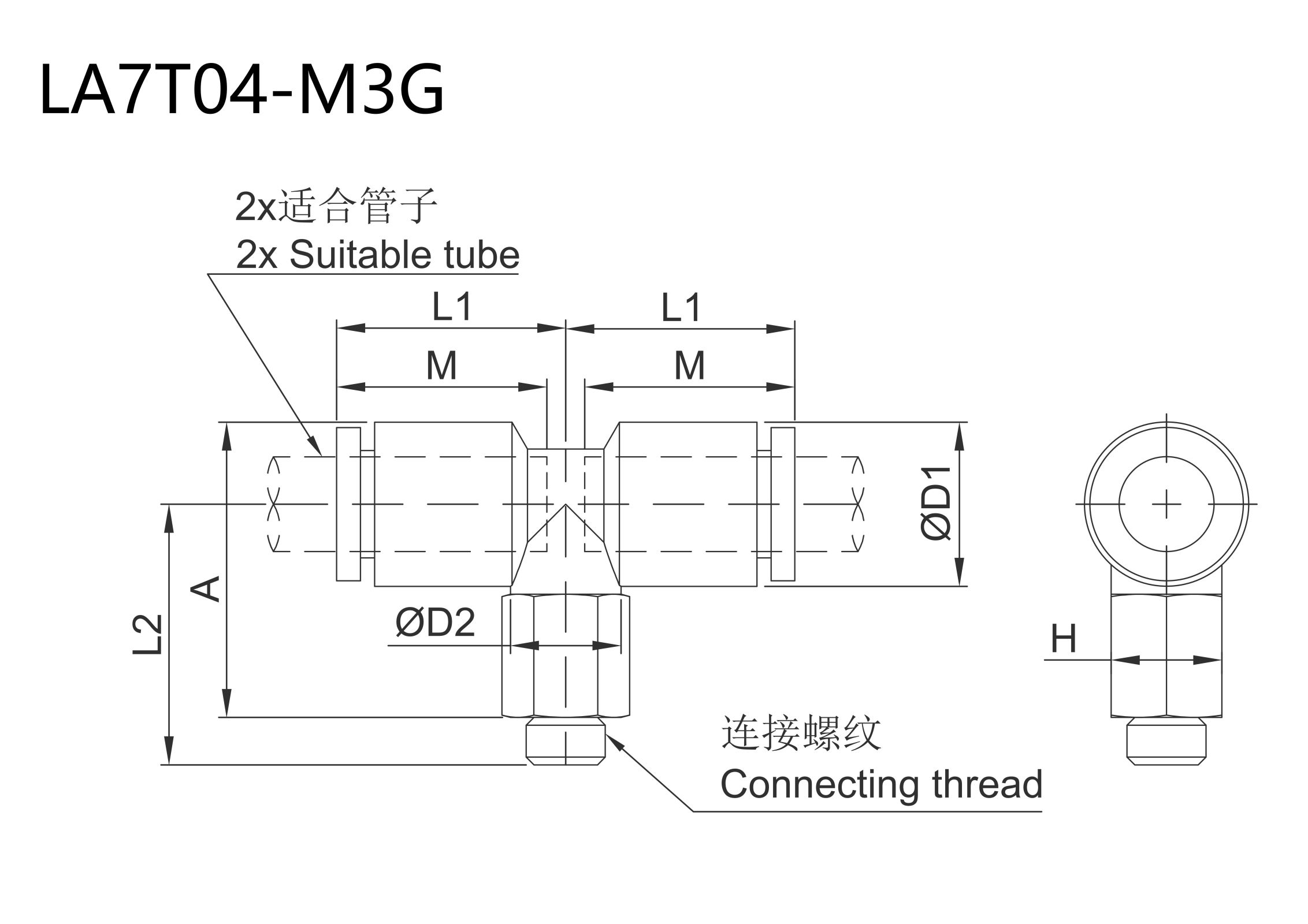 | Tube O.D.mm | Model | Connection thread M | H(mm) | ØD1*(mm) | ØD2(mm) | L1(mm) | L2(mm) | A(mm) | M(mm) | Effective cross-sectional area mm | Minimum Hole Diameter(mm) | Weight | |