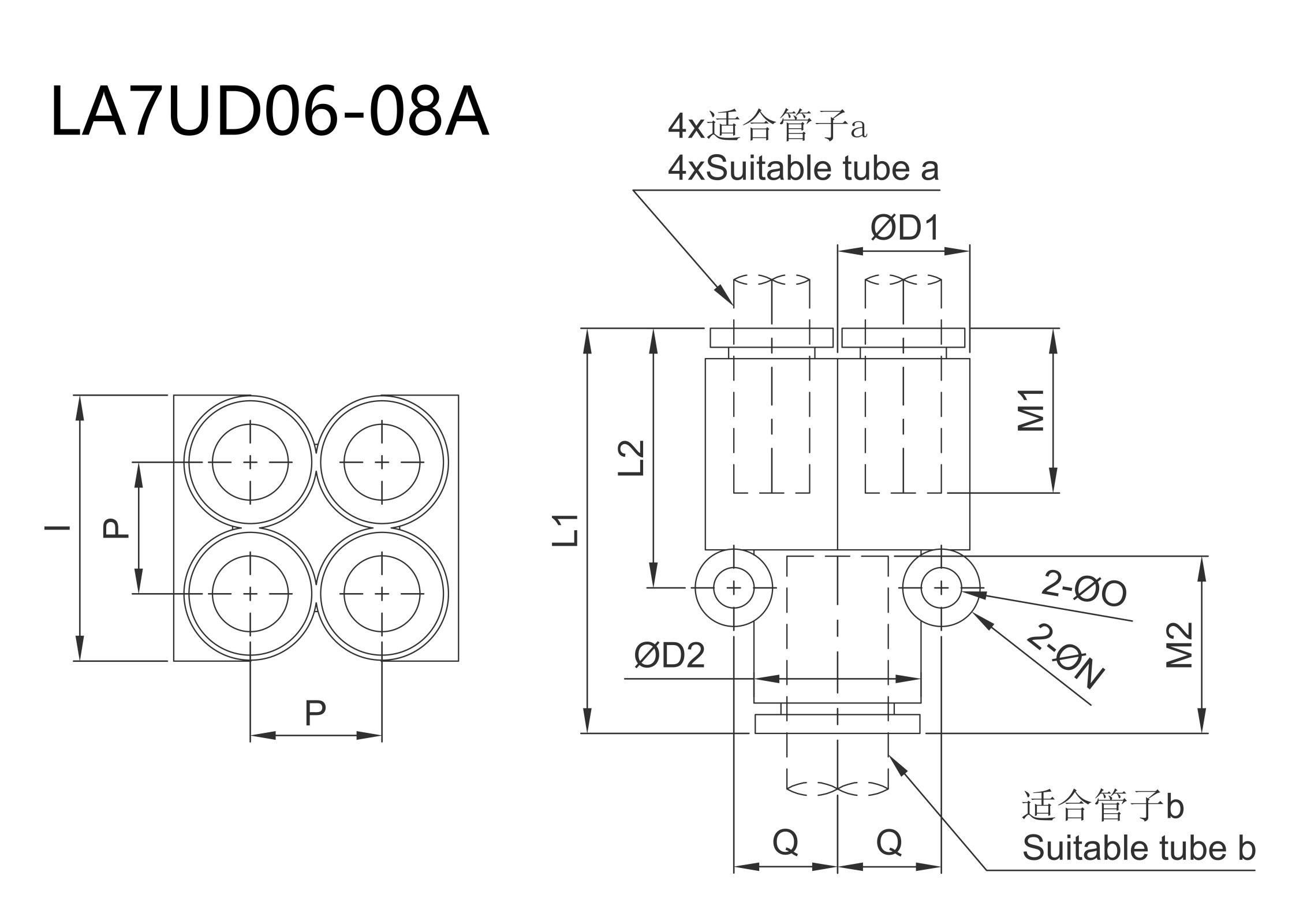 | Tube O.D.mm | Model | ØD1*(mm) | ØD2(mm) | L1(mm) | L2(mm) | P(mm) | l(mm) | M1(mm) | M2(mm) | Q(mm) | ØO(mm) | N(mm) | Effective cross-sectional area mm | Minimum Hole Diameter(mm) | Weight | ||