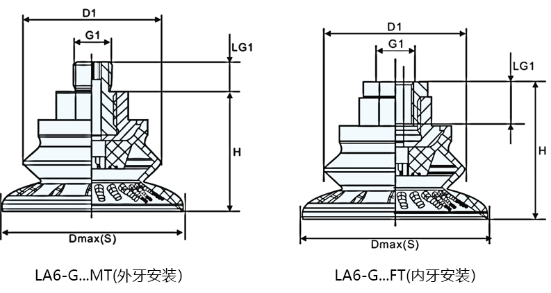 | Model | Nozzles(N)¹ | Pull off(N)² | Lateral force(N)² | Recommended vacuum Inside(mm) | Dmax(S)(mm) | G1(mm) | D1(mm) | H(mm) | LG1(mm) | Weight |